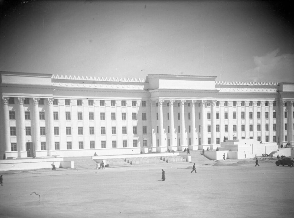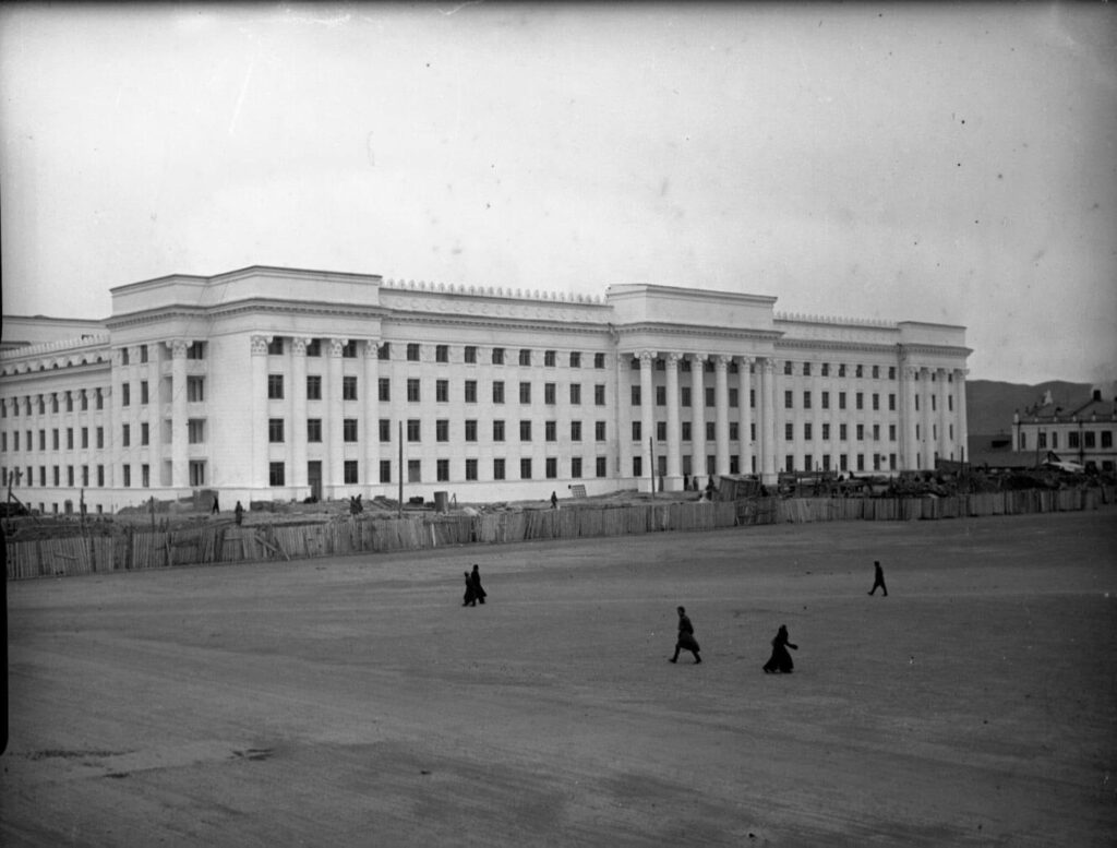 Дараа нь засан хүмүүжүүлэх газраас 4000 хоригдлыг гэрээгээр, иргэдээс 400 ажилчдыг хөлсөөр авч ажиллуулж 1948 оны өвөл суурийн ажлыг дуусгажээ. Гэтэл 1949 оны зун тааз нь тавигдаж дууссан барилгын модон хэсгүүд нь шатаж зөвхөн төмөр, туйпуу хэсгүүд нь үлдсэн байна. Энэ тухай уг барилгыг хариуцан бариулж байсан ахмад барилгачид Д.Жанцансамбуу гуай дурсан ярихдаа: “Д.Гончиг /сүүлд барилгын яамны сайд болсон/ бид хоёр барилгын нурсан хэсэг дээр гараад бууж чадахгүй дүүжингээр бууж байлаа. Барьсан хэсэг шатсаны дараа барилгачдыг жигдрүүлж дотоодын 300, гадаадын 500 хоригдол /орос, хятад, япон/ хөлсний ажилчин 400, бүгд 1200 хүн ажиллаж ордны барилгын ажлыг дуусгасан юм” гэв. Барилгын ажилчид голдуу мэргэжлийн хүмүүс байсан бөгөөд сантехникийн мэргэжилтнээр ЗХУ-ын Федренко, цахилгааны мэргэжилтнээр мөн ЗХУ-ын Чембелюк түүнийг дагалдаж Даржаагийн Чойдог /сүүлд гавъяат барилгачин болсон/ нар ажиллажээ.